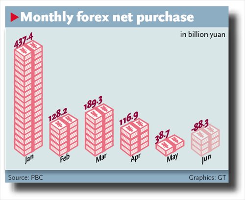 Meanwhile, the People's Bank of China (PBC) and commercial lenders had net sales of 88.3 billion yuan of foreign currencies in June, the central bank said on Tuesday.