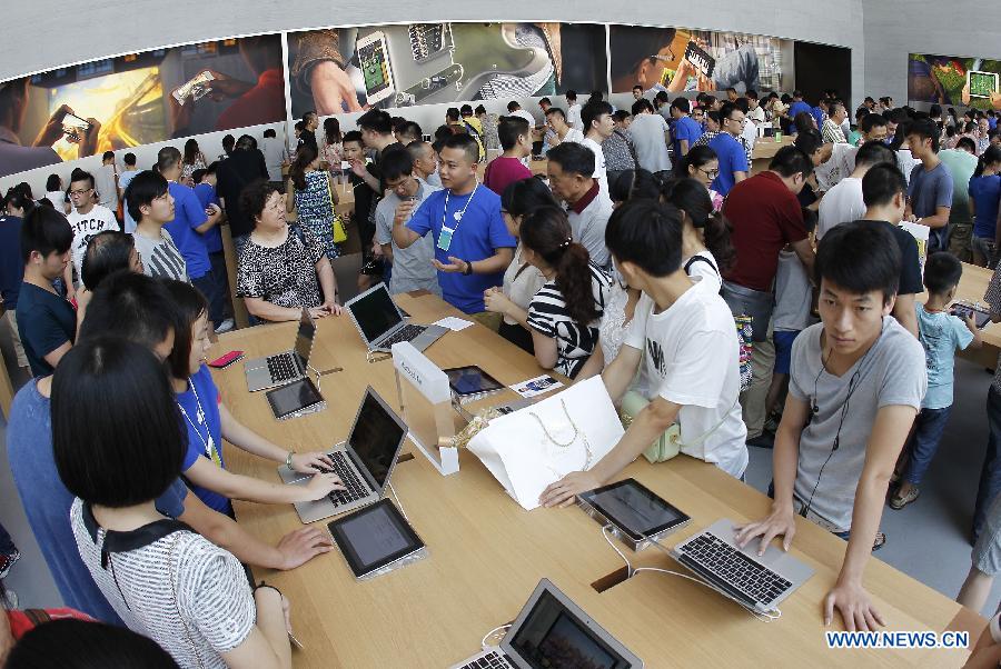 Customers shop in a new Apple Store in Jiangbei District of southwest China's Chongqing, July 26, 2014. Chongqing's first Apple Store went into business on Saturday. (Xinhua/Chen Cheng)