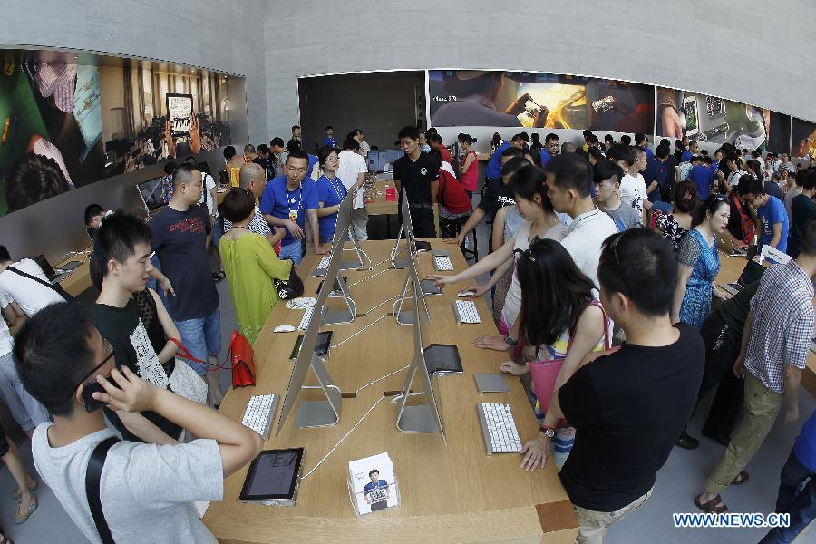 Customers shop in a new Apple Store in Jiangbei District of southwest China's Chongqing, July 26, 2014. Chongqing's first Apple Store went into business on Saturday. (Xinhua/Chen Cheng)