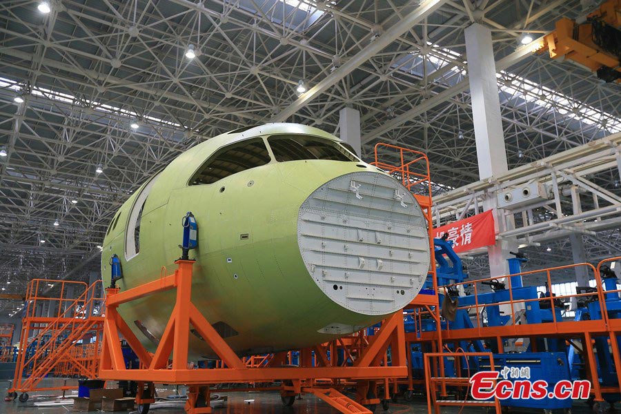 The nose part of C919, China's largest domestically produced aircraft, has rolled off the production line in Chengdu on July 31, 2014. Final assembly of the plane is expected later this year and its producer has received 400 orders. [Photo: China News Service / Wang Jiliang] |