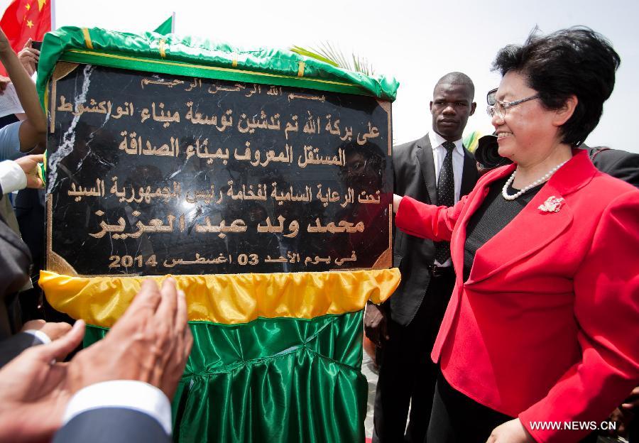 Li Bin (R), Chinese President Xi Jinping's special envoy and head of the National Population and Family Planning Commission, unveils the monument at the completion ceremony of the Port Autonome of Nouakchott, known as the Port of Amitie, in Nouakchott, capital of Mauritania, Aug. 3, 2014. The first three berths of the port were constructed by China from 1979 to 1986 as the second biggest project among China's assistance constructions in Africa. With the completion of Berth 4 and 5 in July, the port is expected to reach a throughput capacity of four million tonnes, nearly 90 percent of the import transportation of the whole country. (Xinhua/Li Jing) |