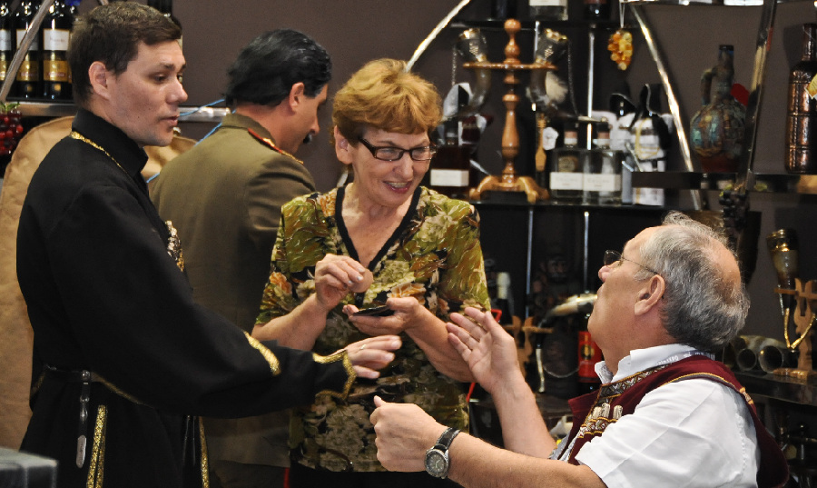 Exhibitors and a visitor(C) talk in Georgia booth at China-Eurasia Expo on Sept. 3. (Xinhuanet/Yan Ting)