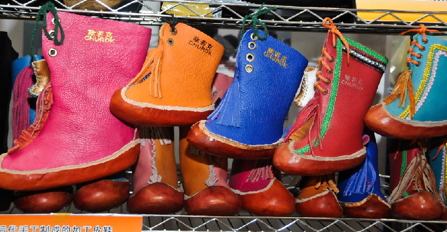 Photo taken on Sept. 3 shows the handmade leather boots at China-Eurasia Expo. (Xinhuanet/Yan Ting)