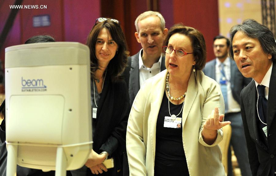 Delegates talk with Scott Hassan, CEO of America-based Suitable Technologies USA, through a remote robot mointoring system during the Annual Meeting of the New Champions 2014, also known as the Summer Davos forum, in Tianjin, north China, Sept. 11, 2014. (Xinhua/Yue Yuewei) |
