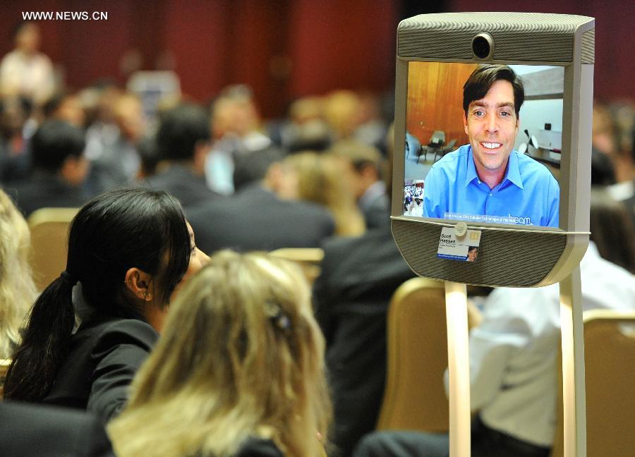Delegates talk with Scott Hassan, CEO of America-based Suitable Technologies USA, through a remote robot mointoring system during the Annual Meeting of the New Champions 2014, also known as the Summer Davos forum, in Tianjin, north China, Sept. 11, 2014. (Xinhua/Yue Yuewei)