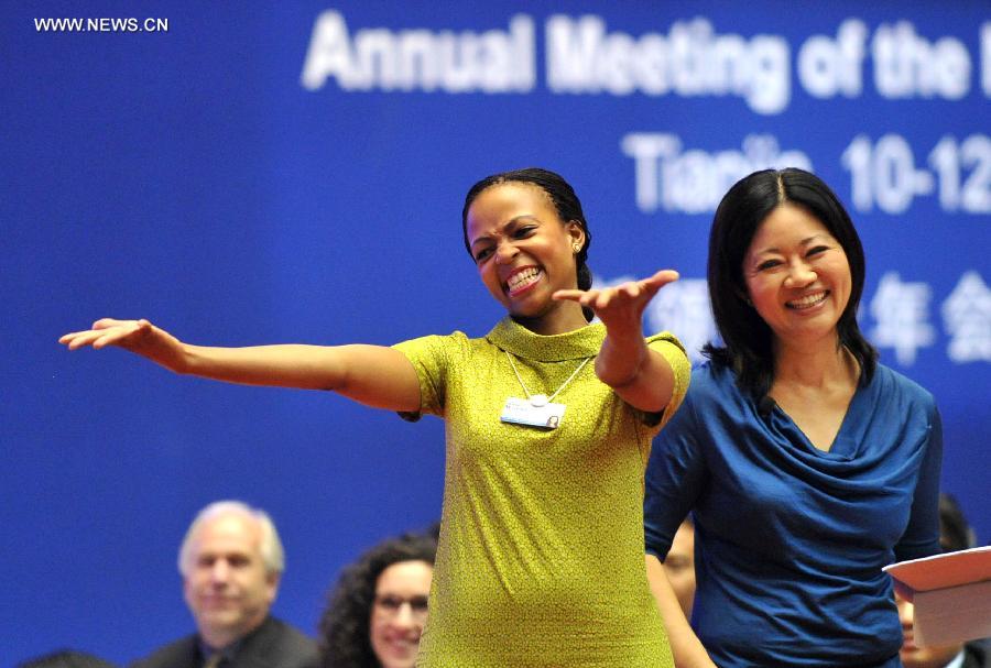 Matsi Modise (L), founder and chief executive officer of the South African Black Entrepreneurs Forum, interacts with audience during the Annual Meeting of the New Champions 2014, also known as the Summer Davos forum, in Tianjin, north China, Sept. 11, 2014. (Xinhua/Yue Yuewei) |