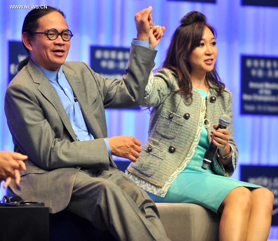 Peggy Liu (R), chairperson of JUCCCE People's Republic of China, interacts with audience during the Annual Meeting of the New Champions 2014, also known as the Summer Davos forum, in Tianjin, north China, Sept. 11, 2014. (Xinhua/Yue Yuewei) |