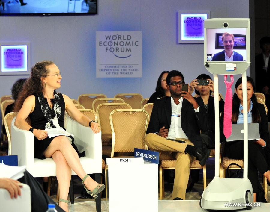 Erik Brynjolfsson, professor of MIT Sloan School of Management, takes part in a discussion through remote robot monitoring system at the Annual Meeting of the New Champions 2014, also known as the Summer Davos forum, in Tianjin, north China, Sept. 12, 2014. (Xinhua/Zhang Chenlin) |