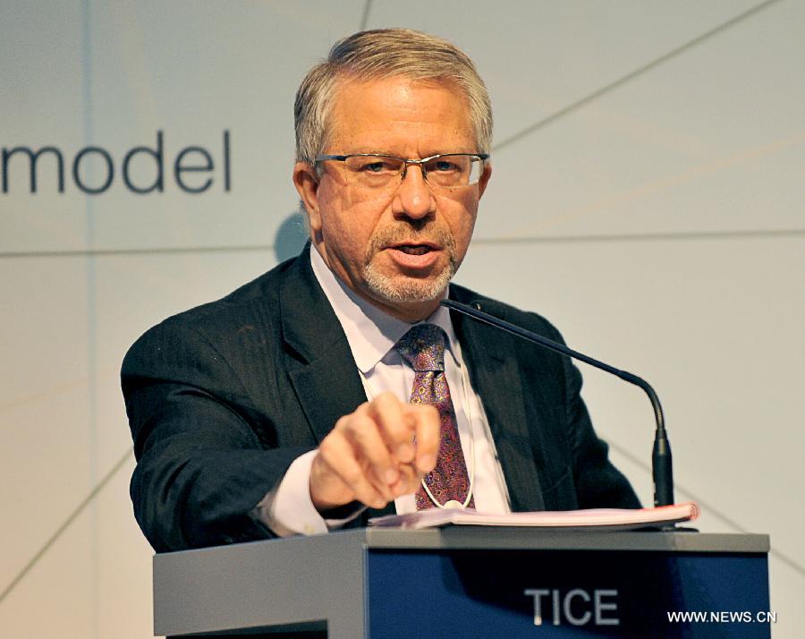 Donn Tice, chairman and chief executive officer of American-based D. Light Design, speaks at the Annual Meeting of the New Champions 2014, also known as the Summer Davos forum, in Tianjin, north China, Sept. 12, 2014. (Xinhua/Yue Yuewei) |
