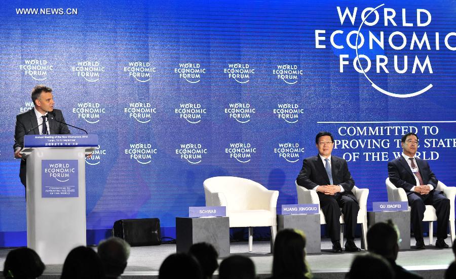 Olivier M. Schwab (1st L), executive director of the Beijing Representative Office of the World Economic Forum, delivers a speech at the closing ceremony of the Annual Meeting of the New Champions 2014, also known as the Summer Davos forum, in Tianjin, north China, Sept. 12, 2014. (Xinhua/Zhang Chenlin) |