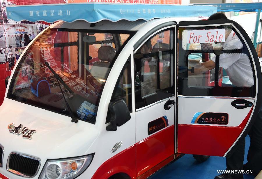 A man looks at an electricity-powered vehicle at the 11th China-ASEAN Expo in Nanning, capital of south China's Guangxi Zhuang Autonomous Region, Sept. 17, 2014. New energy and high tech equipments attracted both exhibitors and visitors from home and abroad during the 11th CAEXPO held in Nanning from Sept. 16 to 19. CAEXPO takes place annually in Nanning and is expected to promote free trade between China and the ASEAN countries. (Xinhua/Zhou Hua)