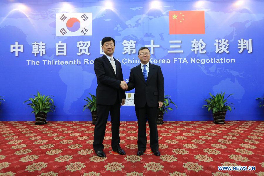 Wang Shouwen (R), Chinese assistant commerce minister, shakes hands with South Korean Assistant Commerce Minister Woo Tae-hee during the opening ceremony of the 13th round of the China-South Korea free trade agreement negotiations in Beijing, capital of China, Sept. 22, 2014. (Xinhua/Xing Guangli) |