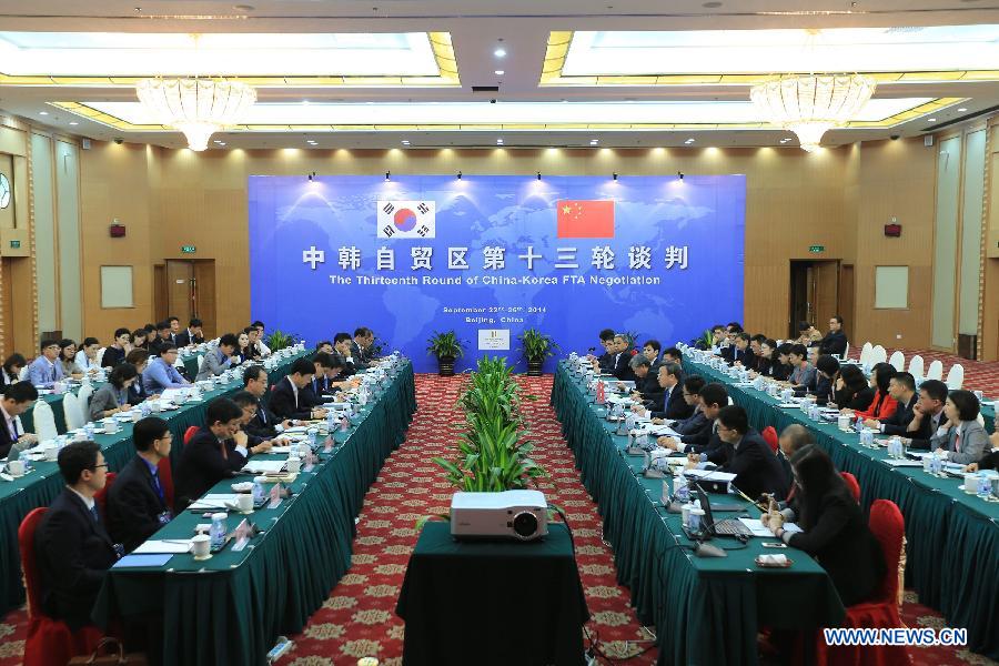 The 13th round of the China-South Korea free trade agreement negotiation is held in Beijing, capital of China, Sept. 22, 2014. (Xinhua/Xing Guangli)
