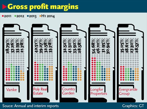 The average net profit margin of 202 listed Chinese property developers was 14.17 percent in the first half of 2014, according to data compiled by real estate consultancy rem.com.cn.