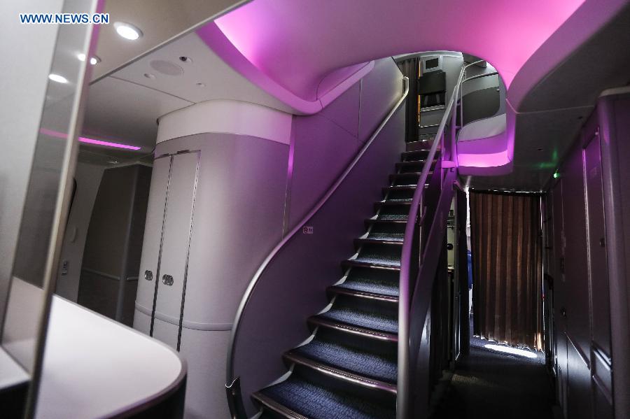 Photo taken on Sept. 30, 2014 shows the cabin of a Boeing 747-8 of Air China, China's biggest airline, in Seattle, the United States. Air China on Monday received the latest Boeing 747-8 Intercontinental airplane at a delivery ceremony in Seattle and on Wednesday flew the plane back to Beijing, China. (Xinhua/Zhang Yuwei) |