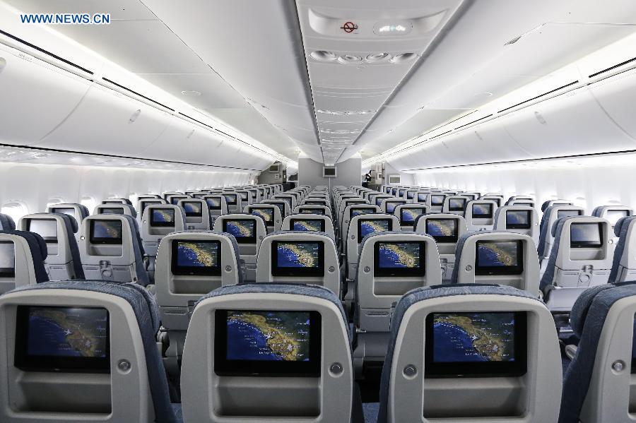 Photo taken on Sept. 30, 2014 shows the cabin of a Boeing 747-8 of Air China, China's biggest airline, in Seattle, the United States. Air China on Monday received the latest Boeing 747-8 Intercontinental airplane at a delivery ceremony in Seattle and on Wednesday flew the plane back to Beijing, China. (Xinhua/Zhang Yuwei) |