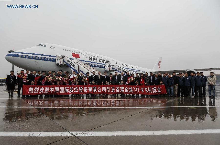 Staff members pose for photos after the first Boeing 747-8 Intercontinental airplane of Air China, China's biggest airline, landing at Beijing Capital Airport in Beijing, China, Oct. 1, 2014. Air China on Monday received the latest Boeing 747-8 at a delivery ceremony in Seattle and on Wednesday flew the plane back to Beijing. (Xinhua/Zhang Yuwei) |