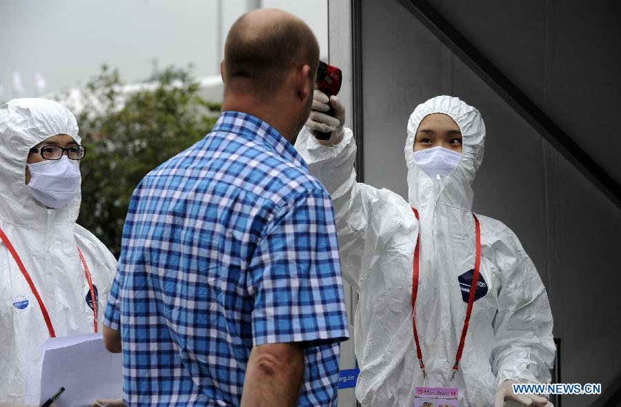 A volunteer takes the temperature of a visitor at the entrance of the exhibition hall of the China Import and Export Fair, also known as the Canton Fair, in Guangzhou, capital of south China's Guangdong Province, Oct. 23, 2014. China's largest trade fair Canton Fair opened its 116th session in Guangdong on Wednesday, drawing a huge influx of foreign visitors. Authorities have tightened examination to avoid possible spread of Ebola cases. (Xinhua/Liang Xu) |