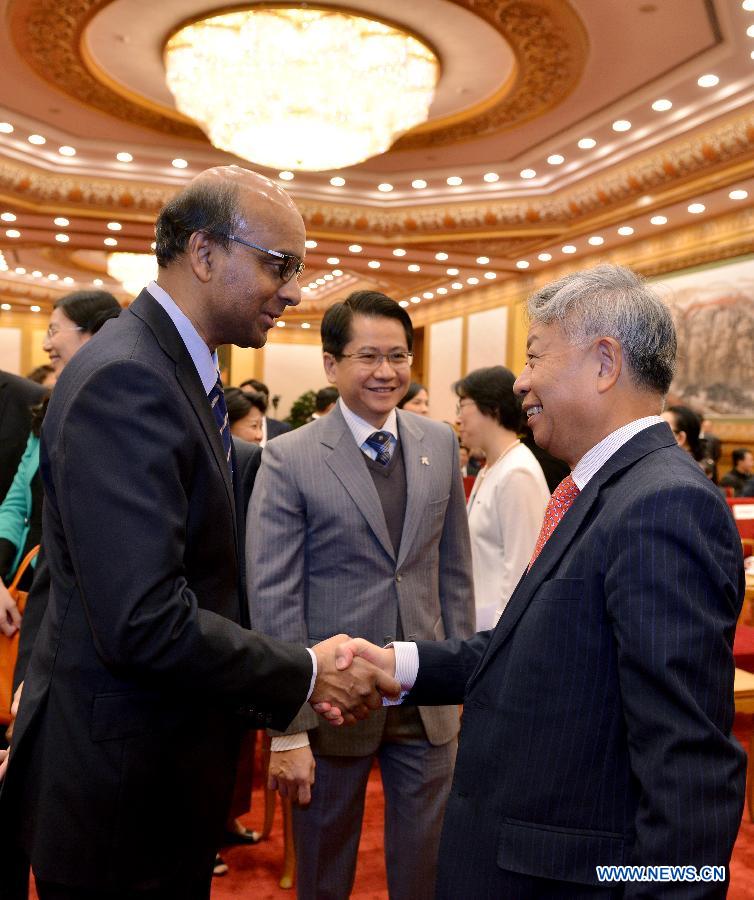 Jin Liqun (R), head of the Asian Infrastructure Investment Bank's (AIIB) preparatory group under China's Ministry of Finance, meets with Singapore's Deputy Prime Minister and Minister for Finance Tharman Shanmugaratnam (L), before the signing ceremony of the Memorandum of Understanding on Establishing AIIB in Beijing, capital of China, Oct. 24, 2014. Twenty-first Asian countries that are willing to join AIIB as founding members on Friday signed the Memorandum of Understanding on Establishing AIIB. (Xinhua/Li Xin) |