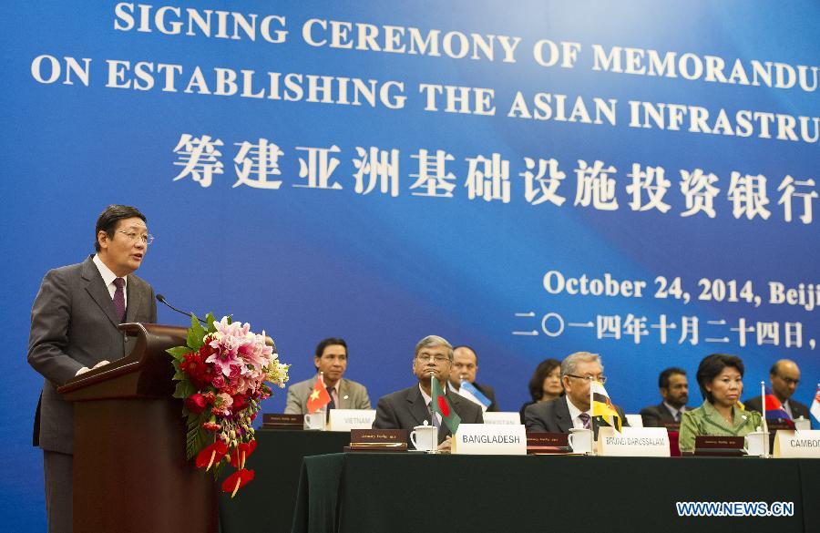 Chinese Finance Minister Lou Jiwei speaks at the signing ceremony of the Memorandum of Understanding on Establishing Asian Infrastructure Investment Bank (AIIB) in Beijing, capital of China, Oct. 24, 2014. Twenty-first Asian countries that are willing to join AIIB as founding members on Friday signed the Memorandum of Understanding on Establishing AIIB. (Xinhua/Huang Jingwen) |