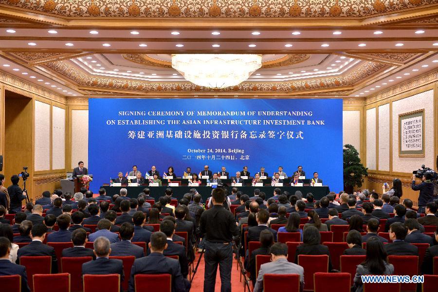 Photo taken on Oct. 24, 2014 shows the scene of the signing ceremony of the Memorandum of Understanding on Establishing Asian Infrastructure Investment Bank (AIIB) in Beijing, capital of China. Twenty-first Asian countries that are willing to join AIIB as founding members on Friday signed the Memorandum of Understanding on Establishing AIIB. (Xinhua/Li Xin) |