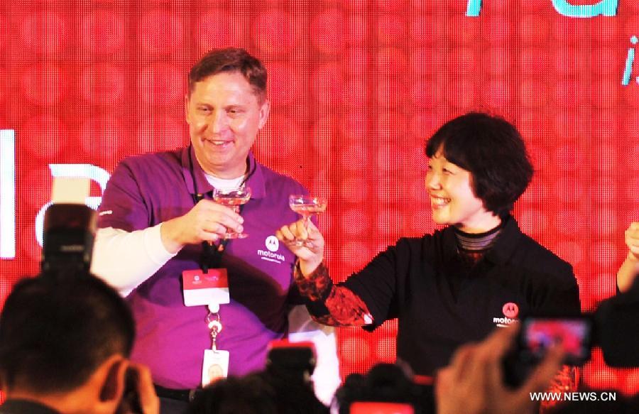 Gregg Locher (L), director of Business Operation at Motorola Mobility, and Lenovo Group's Senior Vice President Qiao Jian toast while attending a celebration in Beijing, China, Oct. 31, 2014. Lenovo Group, the world's biggest personal computer maker, said on Oct. 30 it has fully acquired Motorola's mobile business, making Lenovo world's third largest smartphone maker. In the 2.9 billion U.S.dollar deal, Lenovo took over the Motorola brand and Motorola's portfolio of innovative smartphones like Moto X, Moto G and Moto E series, as well as the future Motorola product roadmap, said Lenovo. (Xinhua/Li Wen) |