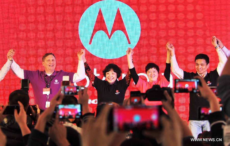 Gregg Locher (1st L), director of Business Operation at Motorola Mobility, and Lenovo Group's Senior Vice President Qiao Jian (2nd L) gesture while attending a celebration in Beijing, China, Oct. 31, 2014. Lenovo Group, the world's biggest personal computer maker, said on Oct. 30 it has fully acquired Motorola's mobile business, making Lenovo world's third largest smartphone maker. In the 2.9 billion U.S.dollar deal, Lenovo took over the Motorola brand and Motorola's portfolio of innovative smartphones like Moto X, Moto G and Moto E series, as well as the future Motorola product roadmap, said Lenovo. (Xinhua/Li Wen) |