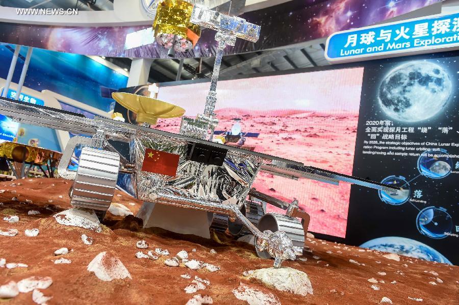 A model of the Mars rover is seen ahead of the 10th China International Aviation and Aerospace Exhibition in Zhuhai, south China's Guangdong Province, Nov. 9, 2014. Some 700 exhibitors at home and abroad with 130-plus planes will attend the six-day airshow from November 11 to 16. (Xinhua/Liang Xu) |