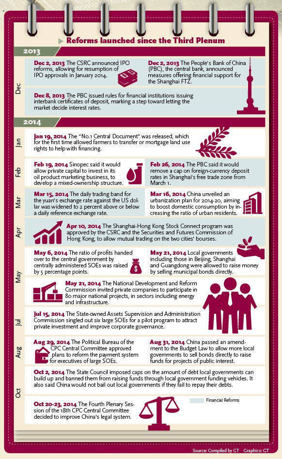 Over the past year, China's top leadership has been trying to move the economy toward a more sustainable path, with a slew of reforms announced at the Third Plenary Session of the 18th Communist Party of China (CPC) Central Committee in November 2013. The recently concluded Fourth Plenary Session of the 18th CPC Central Committee proposed reinforcing legislation in key areas and speeding up improvements to the legal system to reflect equal rights, opportunities and fair rules, all heralding a new chapter in the development of the Chinese legal system. Amid short-term difficulties caused by structural adjustment and the "new norm" of slower economic growth, China is set to harvest the fruits from local fiscal and taxation reform and mixed-ownership reform of State-owned enterprises (SOEs), as well as financial and stock reforms. The Global Times will dedicate three issues from Tuesday to examining the impact of the reforms in transforming China. The following focuses on the financial reforms unveiled in the past year.