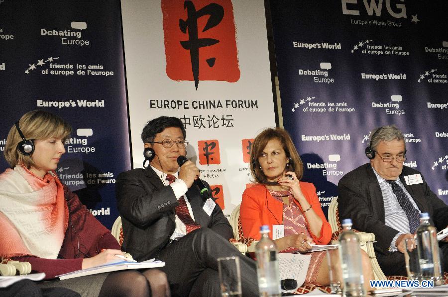 Chi Fulin (2nd L), president of the China Institute for Reform and Development speaks during the 4th Europe China Forum in Brussels, Belgium, Nov. 18, 2014. (Xinhua/Ye Pingfan)