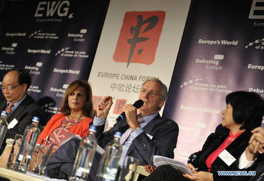 European Investment Bank (EIB) representative to Brussels Ben Knapen (2nd R) speaks during the 4th Europe China Forum in Brussels, Belgium, Nov. 18, 2014. (Xinhua/Ye Pingfan)