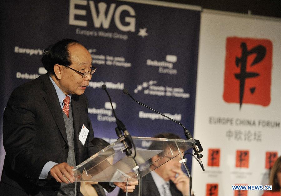 Lv Fengding, vice president of the China Public Diplomacy Association addresses the 4th Europe China Forum in Brussels, Belgium, Nov. 18, 2014. (Xinhua/Ye Pingfan)