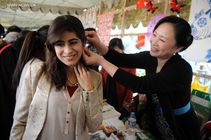 A Pakistani girl tries Chinese jewellery at a stall during Pakistan Foreign Office Women's Association (PFOWA) Annual Charity Bazaar in Islamabad, capital of Pakistan, on Dec. 7, 2014. The one-day charity bazaar was organized by the PFOWA in collaboration with diplomatic corps in Islamabad on Sunday. (Xinhua/Ahmad Kamal) |