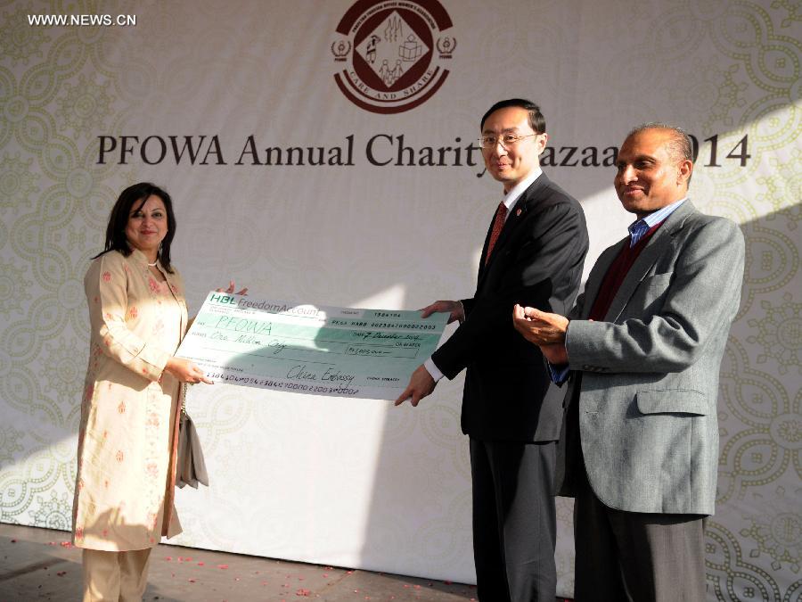 Chinese Ambassador to Pakistan Sun Weidong (C) presents donation cheque of one million rupees (about 9,900 U.S. dollars) to President of Pakistan Foreign Office Women's Association (PFOWA) Najia Aizaz Ahmad (L) during the PFOWA Annual Charity Bazaar in Islamabad, capital of Pakistan, on Dec. 7, 2014. The one-day charity bazaar was organized by the PFOWA in collaboration with diplomatic corps in Islamabad on Sunday. (Xinhua/Ahmad Kamal) |