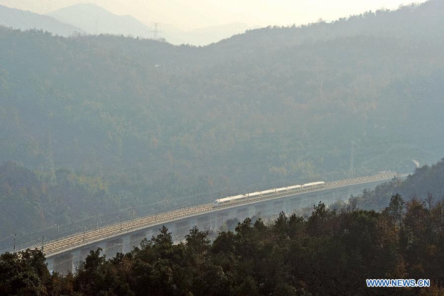 A test high-speed train pulls out of the Yiwu Railway Station during a trial operation of the Hangzhou-Nanchang railroad, a part of the section of the Shanghai-Kunming high-speed railway, in Yiwu, east China's Zhejiang Province, Dec. 4, 2014. The Hangzhou-Nanchang high-speed railway, which connects Hangzhou and Nanchang, capitals of east China's Zhejiang and Jiangxi Provinces respectively, will start operation on Dec. 10. The Hangzhou-Nanchang railway, which will link with the newly-operational Nanchang-Changsha high-speed railway, is expected to facilitate easy connection between China's central regions and prosperous east. The Shanghai-Kunming railway will eventually joins Shanghai in the east and Kunming in the southwest. (Xinhua/Tan Jin) |