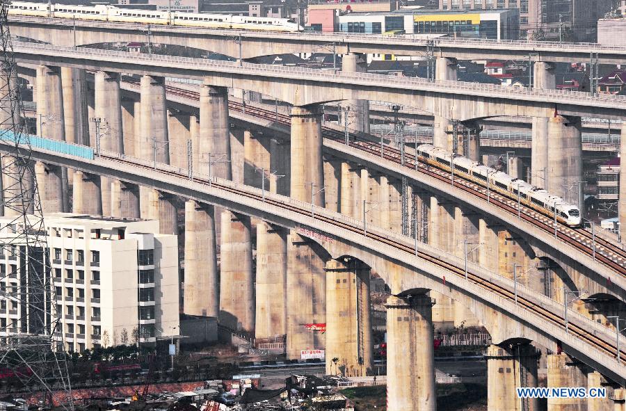 A test high-speed train (R, lower) runs on a intersection bridge during a trial operation of the Hangzhou-Nanchang railroad, a part of the section of the Shanghai-Kunming high-speed railway, in Shaoxing, east China's Zhejiang Province, Dec. 6, 2014. The Hangzhou-Nanchang high-speed railway, which connects Hangzhou and Nanchang, capitals of east China's Zhejiang and Jiangxi Provinces respectively, will start operation on Dec. 10. The Hangzhou-Nanchang railway, which will link with the newly-operational Nanchang-Changsha high-speed railway, is expected to facilitate easy connection between China's central regions and prosperous east. The Shanghai-Kunming railway will eventually joins Shanghai in the east and Kunming in the southwest. (Xinhua/Tan Jin) |