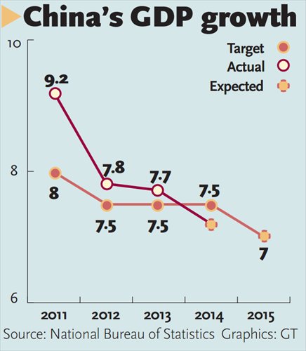 Nomura Securities economists, who also forecast a reduction in the GDP target to 7 percent, said in an e-mail to the Global Times Monday that "Even achieving a lower 7 percent growth target in 2015 will require further policy adjustments because of growing risks to the economy." They added they foresee more government stimulus.