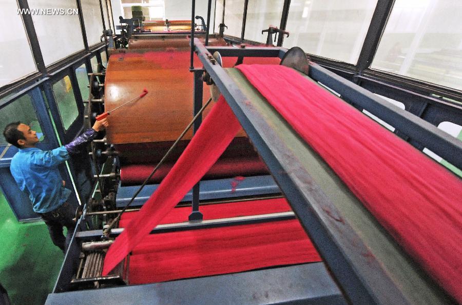 A staff member dusts a machine at a textile company in the Nanxun District of Huzhou City, east China's Zhejiang Province, Dec. 25, 2014. In order to break out the bottleneck of economic development, a series of technical transformation was launched in traditional manufacturing industry in the Nanxun District of Huzhou in 2014. (Xinhua/Tan Jin) |
