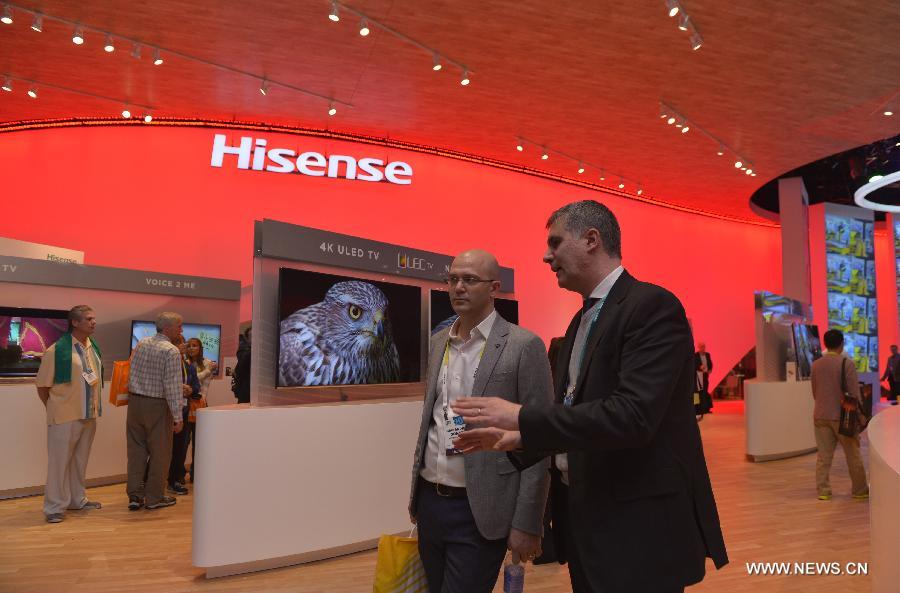 Visitors view UHDTV at the booth of Chinee company Hisense during the 2015 International Consumer Electronics Show (CES) in Las Vegas, the United States, on Jan. 6, 2015. More than 1,000 Chinese enterprises participated in this year's CES. (Xinhua/Yin Bogu) |