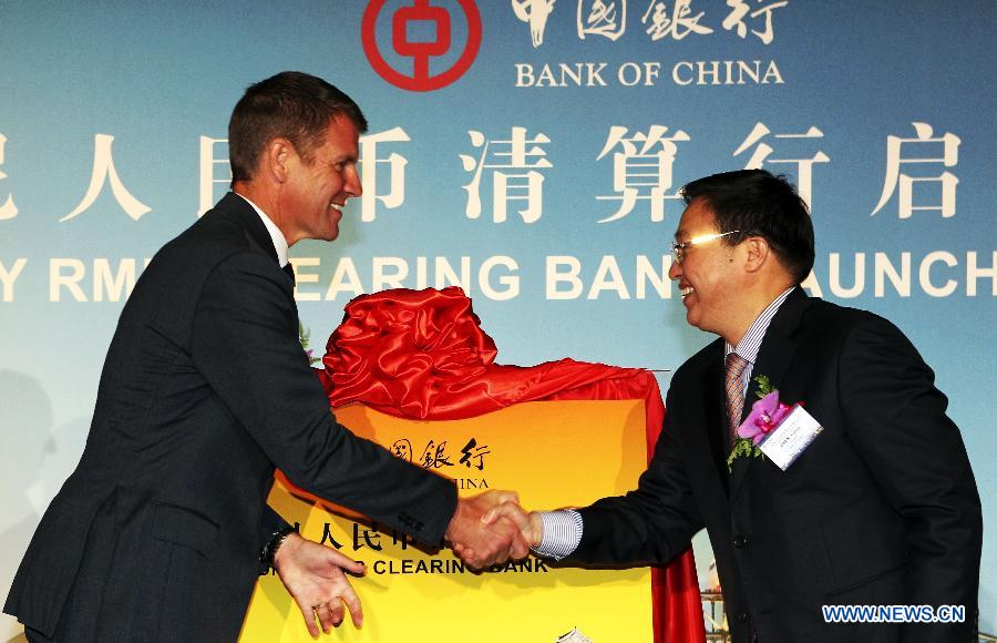 Bank of China President Chen Siqing (R) and Australia's New South Wales state Premier Mike Baird shake hands at the launching ceremony of Bank of China's Sydney RMB clearing bank in Sydney, Australia, Feb. 9, 2015. (Xinhua/Jin Linpeng)