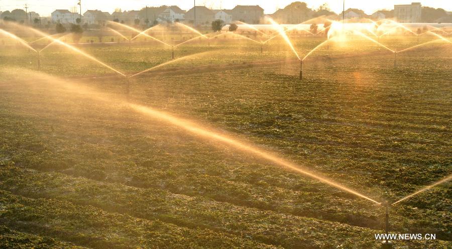 Photo taken on Dec. 29, 2014 shows vegetable watered in a modern agricultural garden in Huzhou City, east China's Zhejiang Province. According to official statistics, the disposable per capita income of farmers in Zhejiang reached 19,373 Yuan in 2014, 1.5 times of the average of the whole country. Zhejiang has ranked the first in disposable per capita income of farmers among provinces and autonomous regions across China for 30 consecutive years. (Xinhua/Tan Jin) |