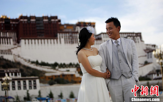 A couple takes wedding photo in front of Potala Palace. (CNS/Du Yang) |