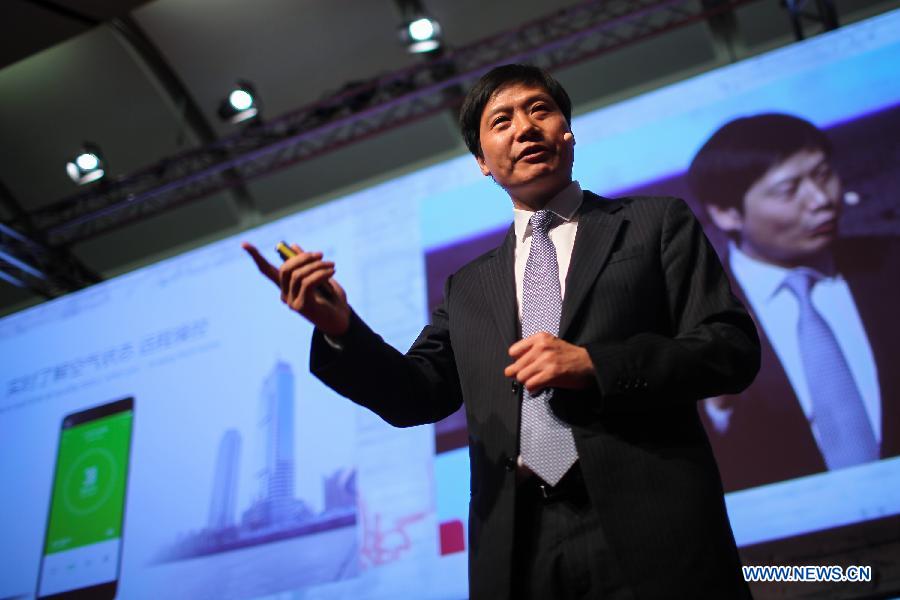 Lei Jun, CEO of Xiaomi Tech, speaks during a summit session of 2015 CeBIT Technology Trade fair in Hanover, Germany, on March 16, 2015. Top IT business fair CeBIT 2015, which features a strong Chinese presence, opened on Sunday in Germany. (Xinhua/Zhang Fan)