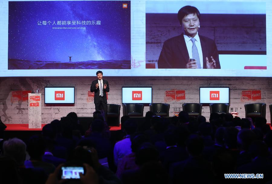 Lei Jun, CEO of Xiaomi Tech, speaks during a summit session of 2015 CeBIT Technology Trade fair in Hanover, Germany, on March 16, 2015. Top IT business fair CeBIT 2015, which features a strong Chinese presence, opened on Sunday in Germany. (Xinhua/Zhang Fan) |