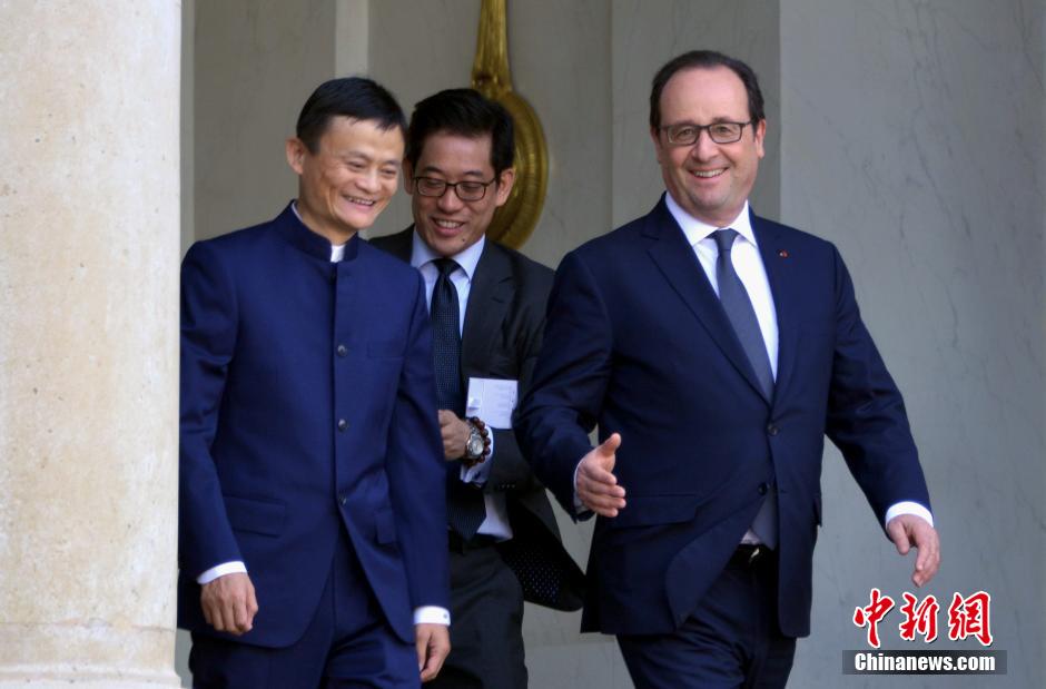 French President Francois Hollande (R) talks with Jack Ma, Chinese entrepreneur and founder of Alibaba Group, in Paris, France, on March 18, 2015. (Photo/Chinanews.com)