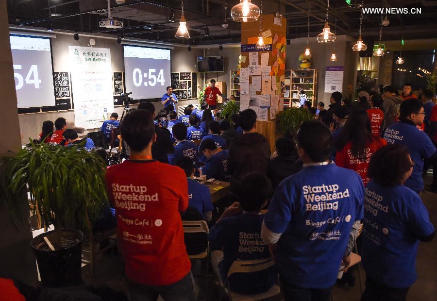 Photo taken on March 13 shows the scene inside a coffee house where a startup weekend is held at Zhongguancun Innovation Street in the Haidian District of Beijing, capital of China. The impact of e-commerce made the street which once was home to shops selling books and clothes a new place for technological innovation. In the past half year, the street attracted over 20 agencies providing services for startups, over 200 funded projects and nearly 500 activities, which helped lots of people realize their dreams. (Xinhua/Luo Xiaoguang) |