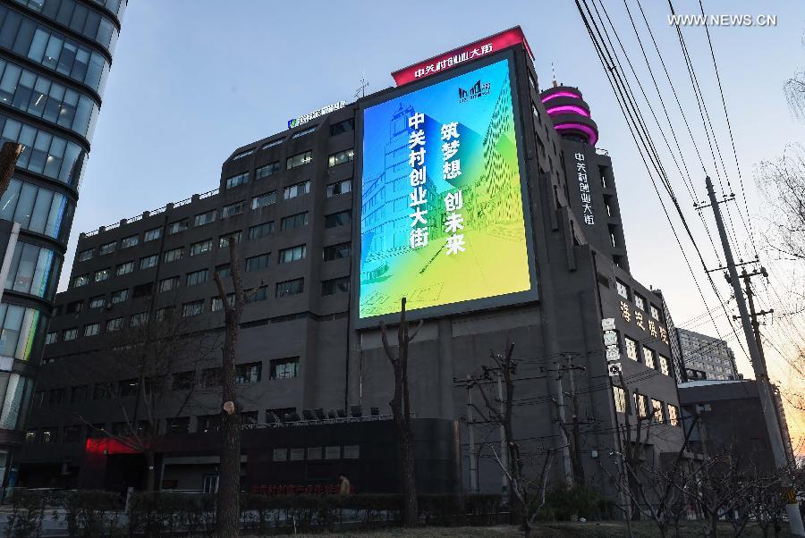 Photo taken on March 13 shows a screen displaying slogans about innovation on a building at Zhongguancun Innovation Street in the Haidian District of Beijing, capital of China. The impact of e-commerce made the street which once was home to shops selling books and clothes a new place for technological innovation. In the past half year, the street attracted over 20 agencies providing services for startups, over 200 funded projects and nearly 500 activities, which helped lots of people realize their dreams. (Xinhua/Luo Xiaoguang) |