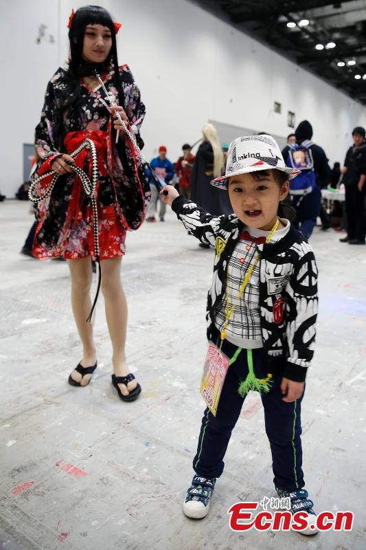 A boy poses with a cosplayer during a comic and animation event at China National Convention Center in Beijing, March 22, 2015. The exhibition opened to the public on Sunday. (Photo: China News Service/Han Haidan)