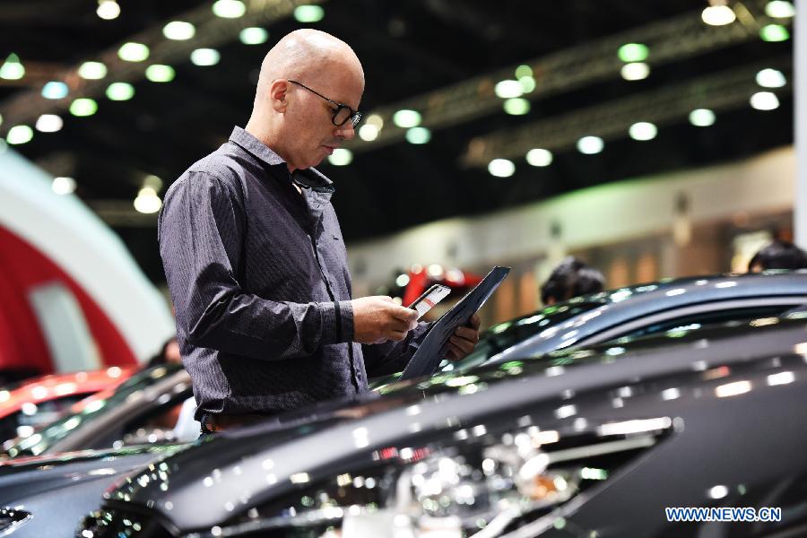 A visitor looks at a car exhibited in the 36th Bangkok International Motor Show in Bangkok, March 25, 2015. The Bangkok International Motor Show will be held from March 25 to April 5. (Xinhua/Li Mangmang)