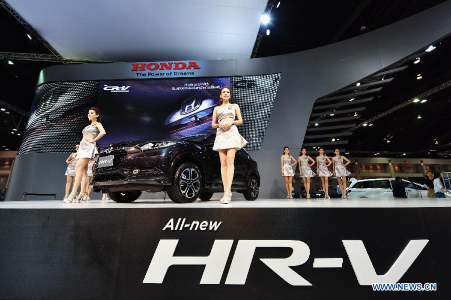 Models pose with a Honda HR-V SUV exhibited in the 36th Bangkok International Motor Show in Bangkok, March 25, 2015. The Bangkok International Motor Show will be held from March 25 to April 5. (Xinhua/Li Mangmang)